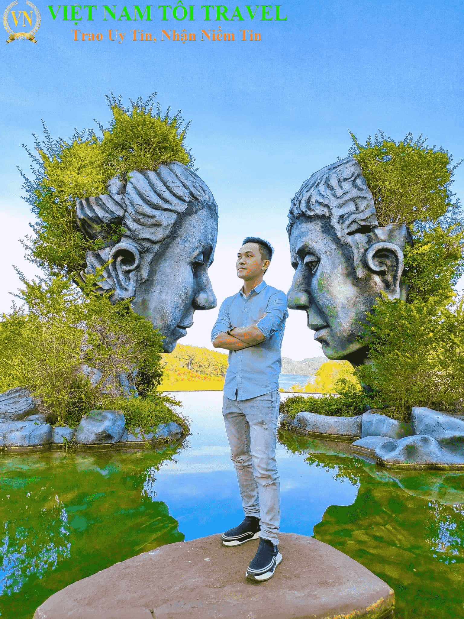 Điểm hấp dẫn nhất nằm ở hai bức tượng khổng lồ. Hướng mặt vào nhau được dựng lên giữa hồ nước nằm trên ngọn đồi. Hai bức tượng như gợi lên câu chuyện tình nổi tiếng ở phố núi về chàng K’lang và nàng H’Biang. Đây cũng là lý do khiến giới trẻ gọi chốn thiên đường này là nơi tình yêu bắt đầu.