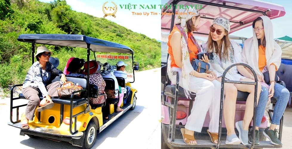 Quý lên xe điện để trải nghiệm và tham quan cảnh đẹp, đời sống của người dân trên đảo.