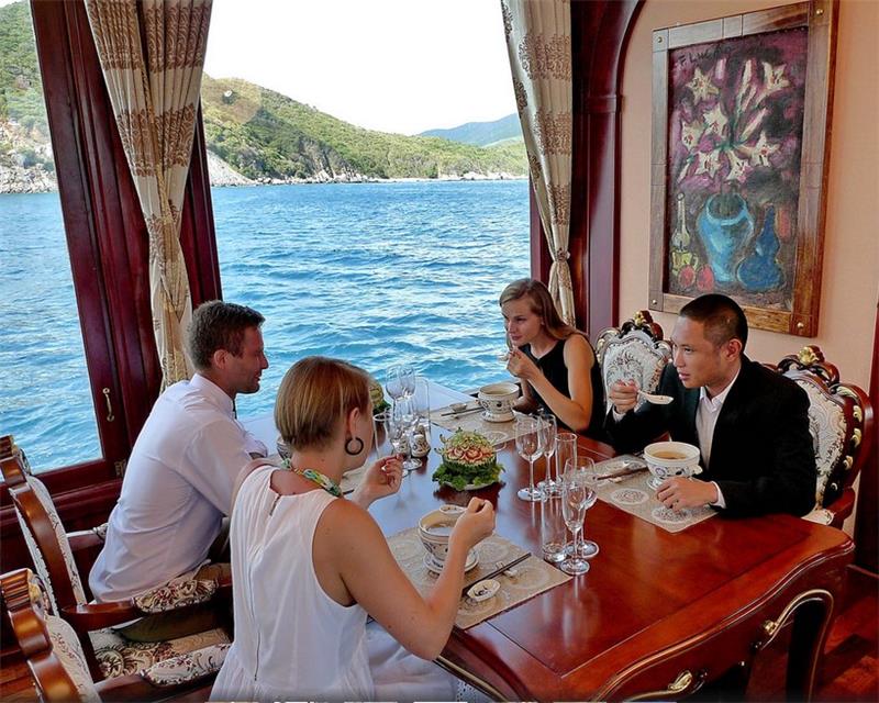 Trải nghiệm cảm giác dễ chịu khi thưởng thức bữa tối thịnh soạn với âm nhạc và sự phục vụ ân cần của đội ngũ nhân viên Emperor Cruises.